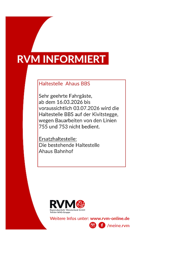 RVM informiert: Sperrhinweis Haltestelle Kivitstegge Buslinien 755 und 753